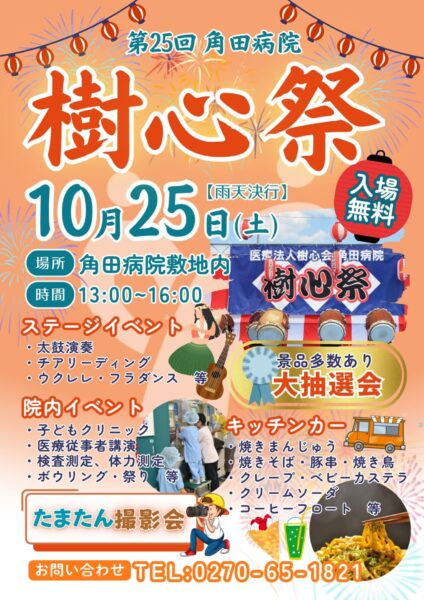 お知らせ news 角田病院 ホームお知らせ6年ぶりに「樹心祭」を開催します! 2025.10.02 お知らせ 6年ぶりに「樹心祭」を開催します! 新型コロナウイルスの影響により、しばらく開催を見合わせておりましたが、地域のみなさまに長く親しまれてきた樹心祭が、このたび6年ぶりに再び開催できることになりました。 現在、当院の職員一同が心を込めて準備を進めており、キッチンカーやステージ企画など、多彩なイベントを予定しております!世代を問わず楽しんでいただけるお祭りですので、ぜひご家族やご友人とお誘い合わせのうえ、お気軽にご参加ください。みなさまにお会いできることを楽しみにしております✨ 一覧に戻る 次へ